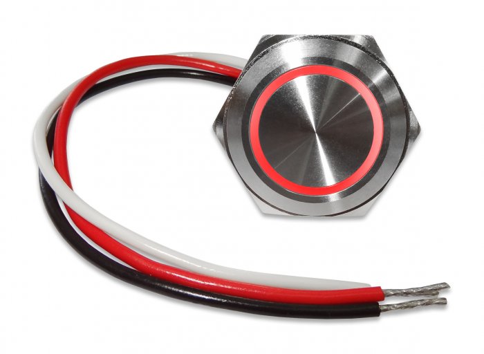 Представляет собой устройство, оснащенное подсвечиваемой кнопкой (красного свечения), фиксирующей гайкой и соединительными проводами.