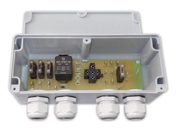 Представляет собой установленную в герметичный корпус монтажную плату в сборе с колодками реле (одна с установленным реле, другая свободная), предохранителями и штыревыми контактами серии 6.3. Корпус оснащен четырьмя гермовводами.